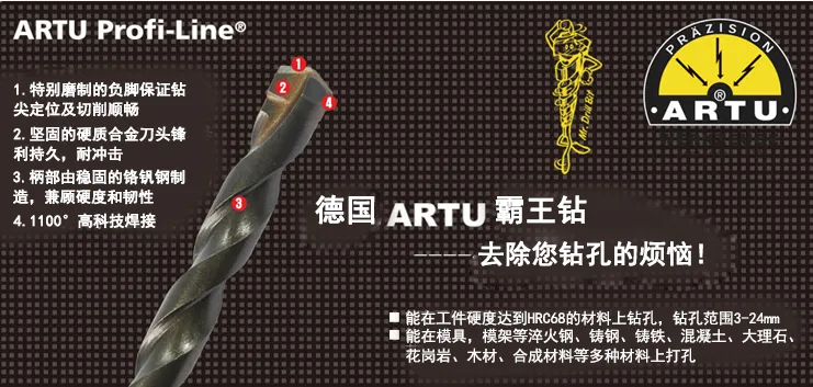 在生产加工过程中,常会碰到一些高硬度的材料,比如耐磨钢板,淬火工件,轴承钢,渗碳钢等。这些材料硬度较高,加工困难,此时可以选择德国ARTU霸王钻(镶硬质合金在钻头),此款钻头可在HRC68的高硬度材料上钻孔。